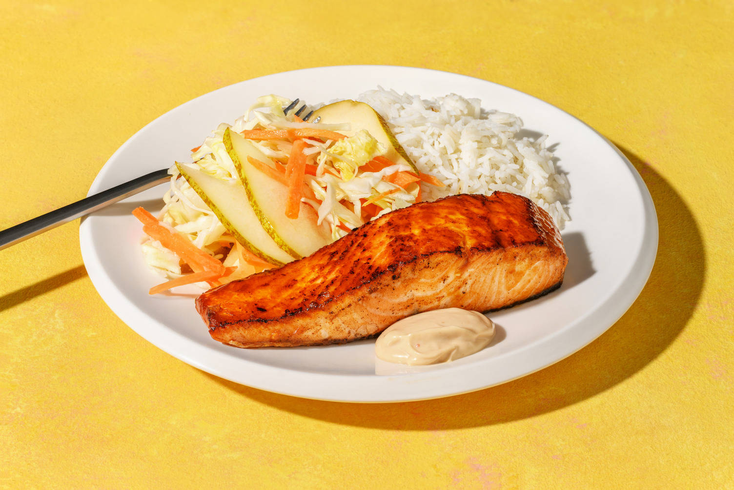 Bland rucola, olivenolie [1/2 spsk I 1 spsk] og et nip peber i en skål.