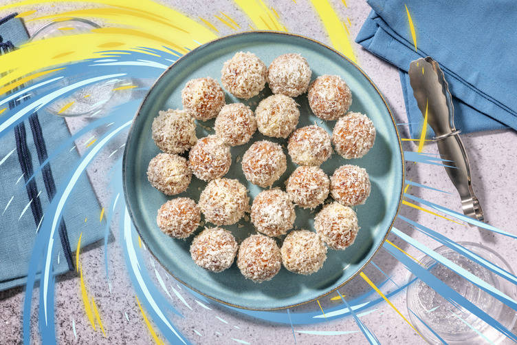Kom resterende kokosmel i en lille skål, og rul kugler i kokosmelet.
