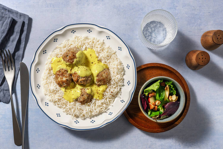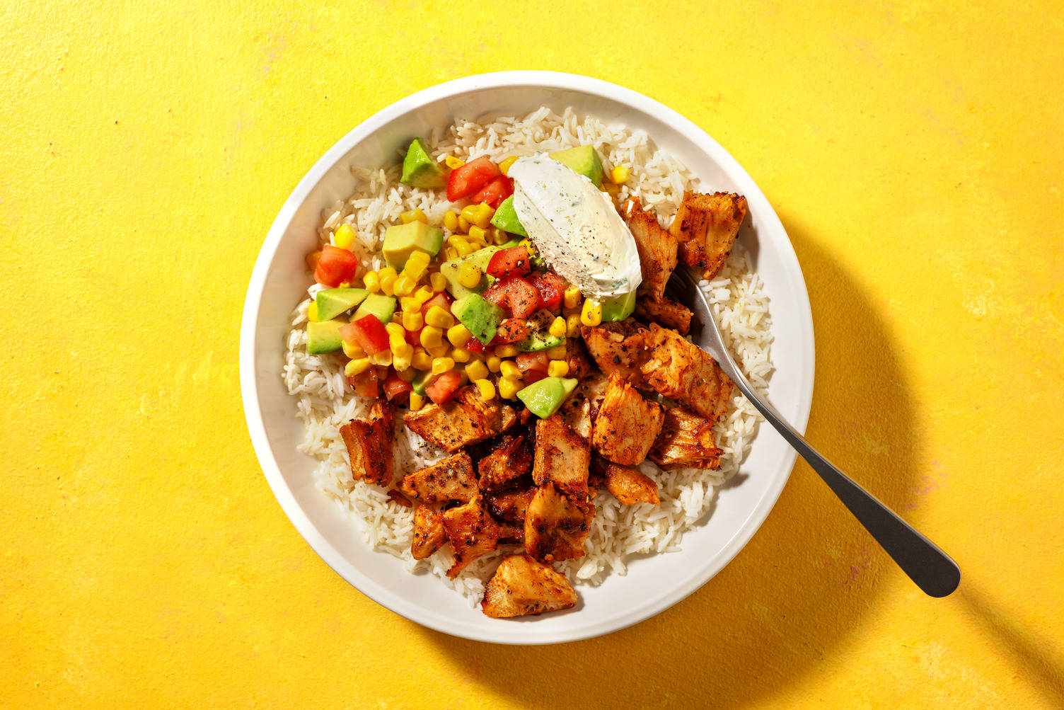 Anret ris i skåle. Top med chili og en klat yoghurt. Server med limebåde.