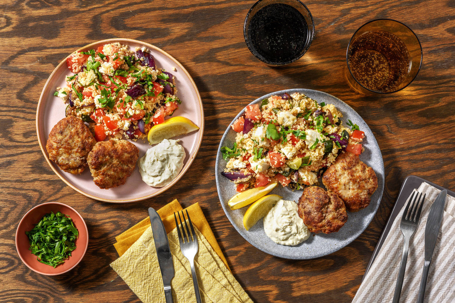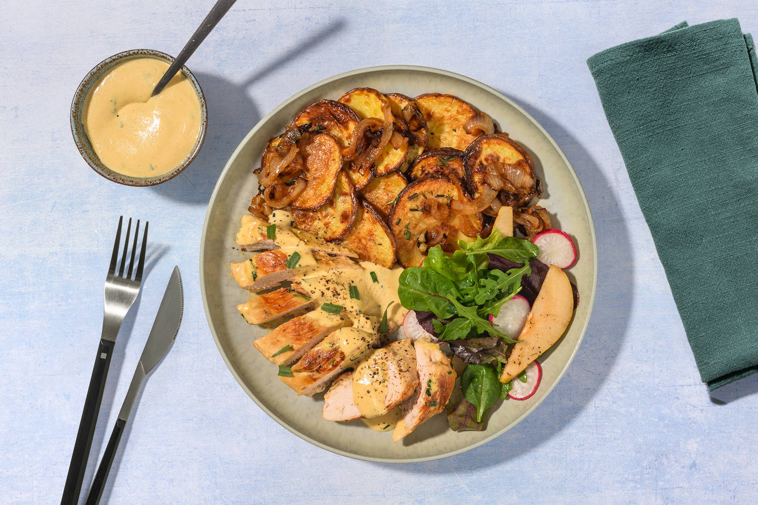 Opvarm en smule olivenolie* i en stegepande ved middelhøj varme. Skær kylling i 2 cm tern. Steg i 2-3 min, eller indtil brunet. Krydr med salt* og peber*. Stil til side på en tallerken.