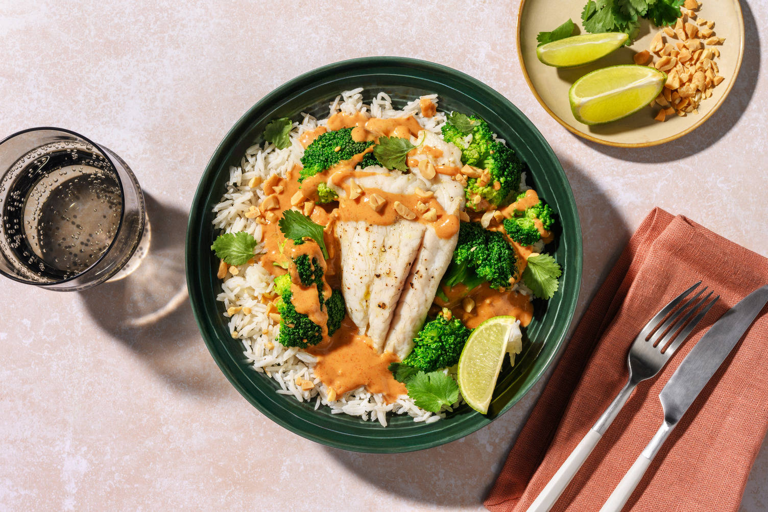 Anret ris og laksa i dybe tallerkener. Drys med chili og peanuts. Server med resterende limebåde.